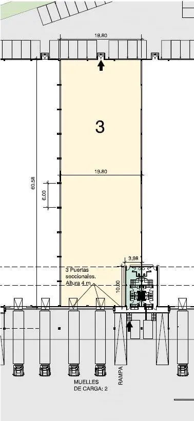Nau logística adossada amb una superfície construïda de 2.587 m² distribuïda en magatzem de 2.361 m² i oficines de 226 m². Possibilitat de dividir en dos mòduls (1.285 i 1.302 m²)
