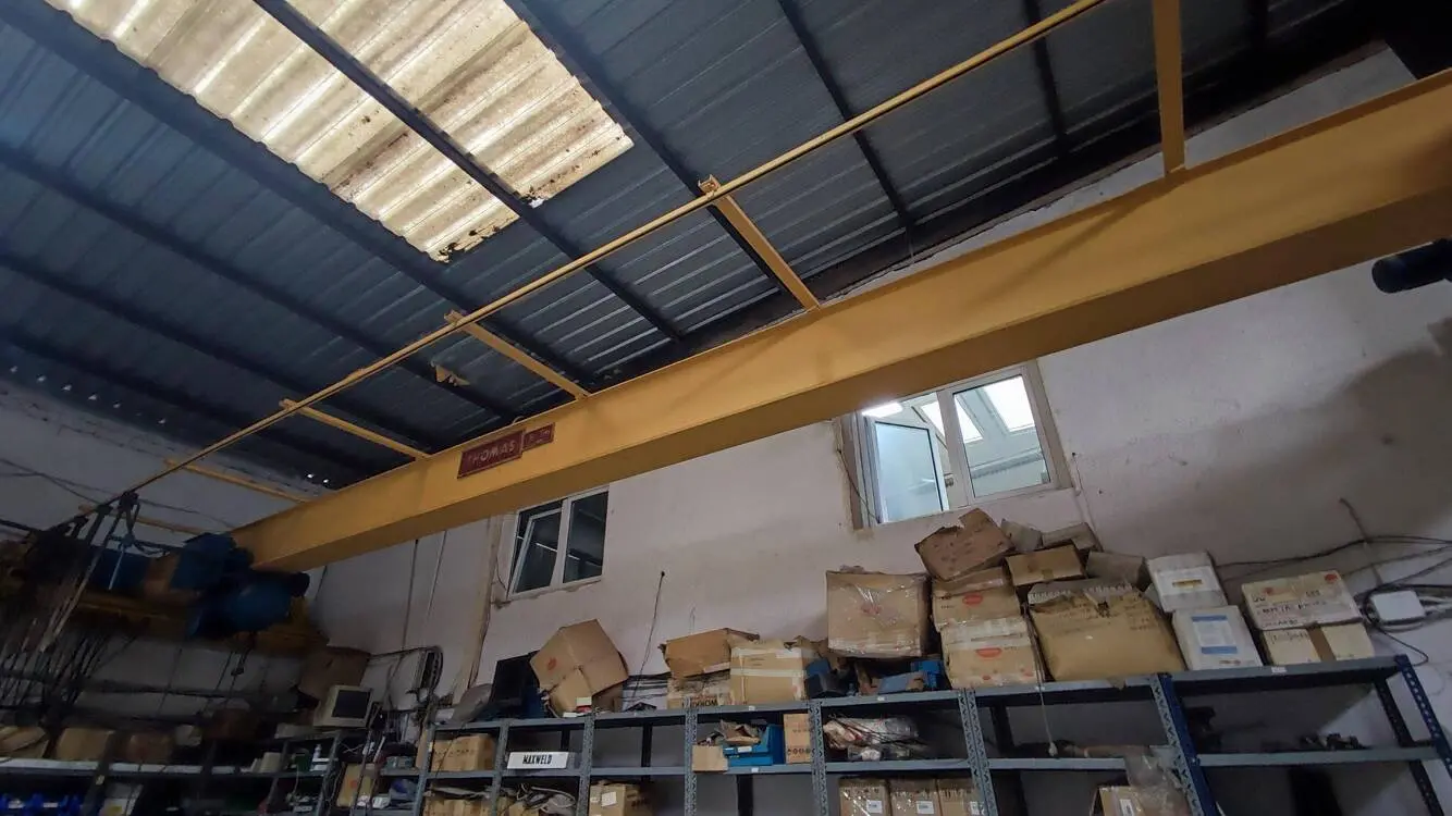 The warehouse features a 6.5-meter ceiling height, a metal roof, a metal structure, a 5-ton overhead crane, a TIR door, and a fire suppression system with extinguishers.