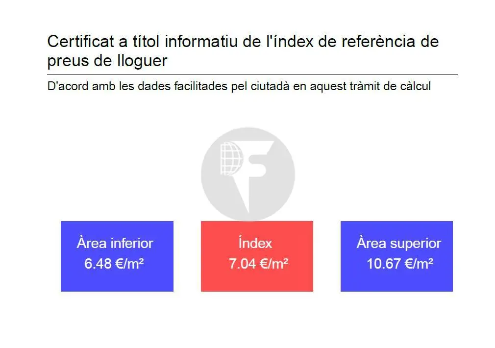 • Índice de referencia Preus de lloguer de Catalunya: Área inferior: 6,48€/m² Medio: 7.04€/m² Área superior: 10.67€/m².