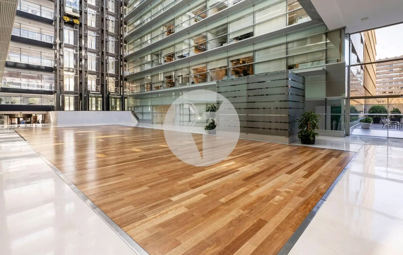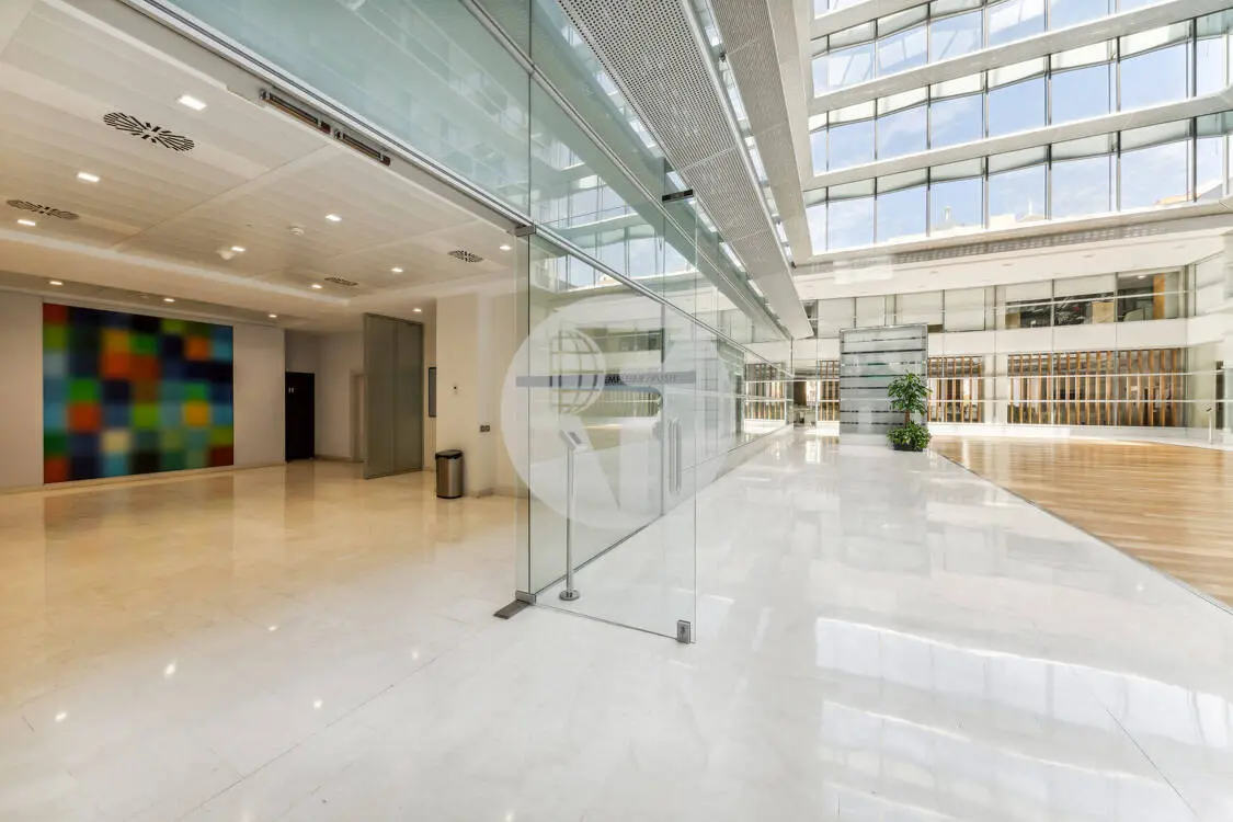 Luminoso hall principal con atrio central y zona de recepción con servicio de facility manager.