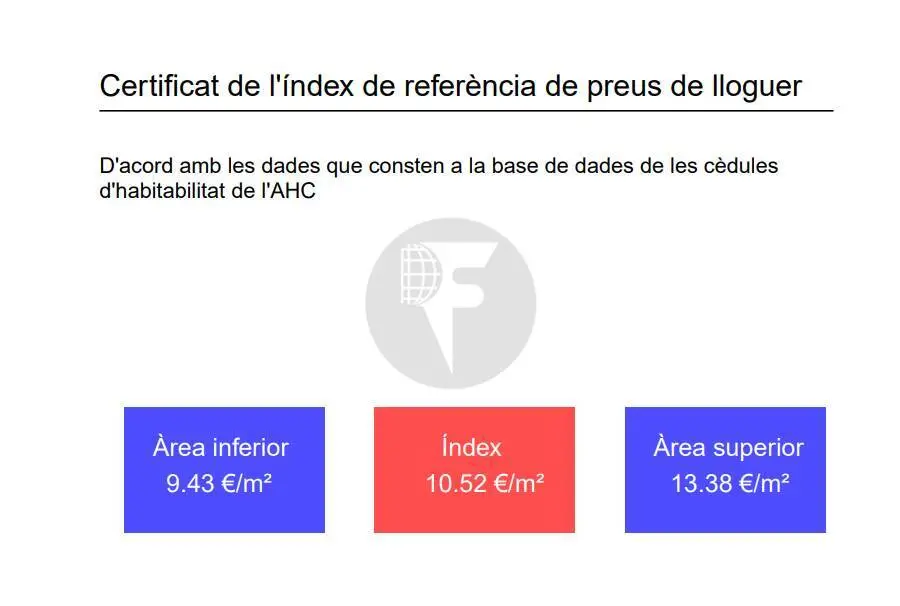 • Índice de referencia Preus de lloguer de Catalunya: Área inferior: 9,43€/m² Medio: 10,52€/m² Área superior: 13,38€/m².